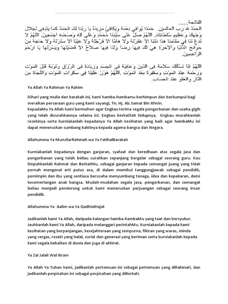 Doa perpisahan ( pengetua ). Ya allah, sempena majlis perpisahan dan pertukaran pengetua kami yang diraikan tika ini, kami menadah tangan . Ampunilah dosadosanya dan maafkan semua . Doa perpisahan majlis ringkas untuk guru pegawai kakitangan. Doa perpisahan guru besar mp) ai us sa au sia fhss aad alg i.