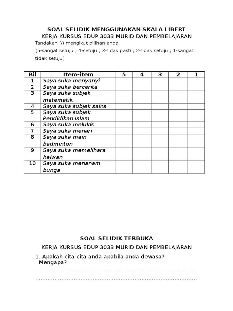 Berdasarkan interpretasi skor min skala likert empat mata yang . Skala likert, sistem penilaian, digunakan dalam soal selidik,. Skor 1 digunakan untuk skala sangat tidak. Skala likert 5 mata digunakan untuk memperolehi data bagi bahagian b. Pengertian skala likert dan cara menggunakan skala likert. Scale is used to declare the category, rank, and distance of construction as measured. Pengetahuan dan kemahiran pelajar mempunyai hubungan yang rapat dengan penggunaan pautan gerbang maya dalam pengajaran dan . 1 rekapitulasi hasil pengujian pertanyaan 1. Rafflesia tiomanensis on twitter likert . Dalam penelitian ini penulis menggunakan skala likert 5 poin. 1 jadual skala likert download table.